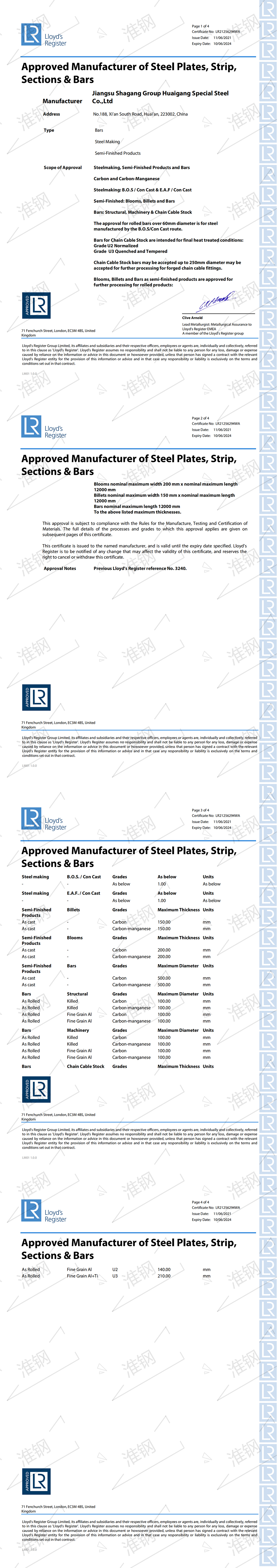英国劳氏船级社(LR)锚链钢认证证书