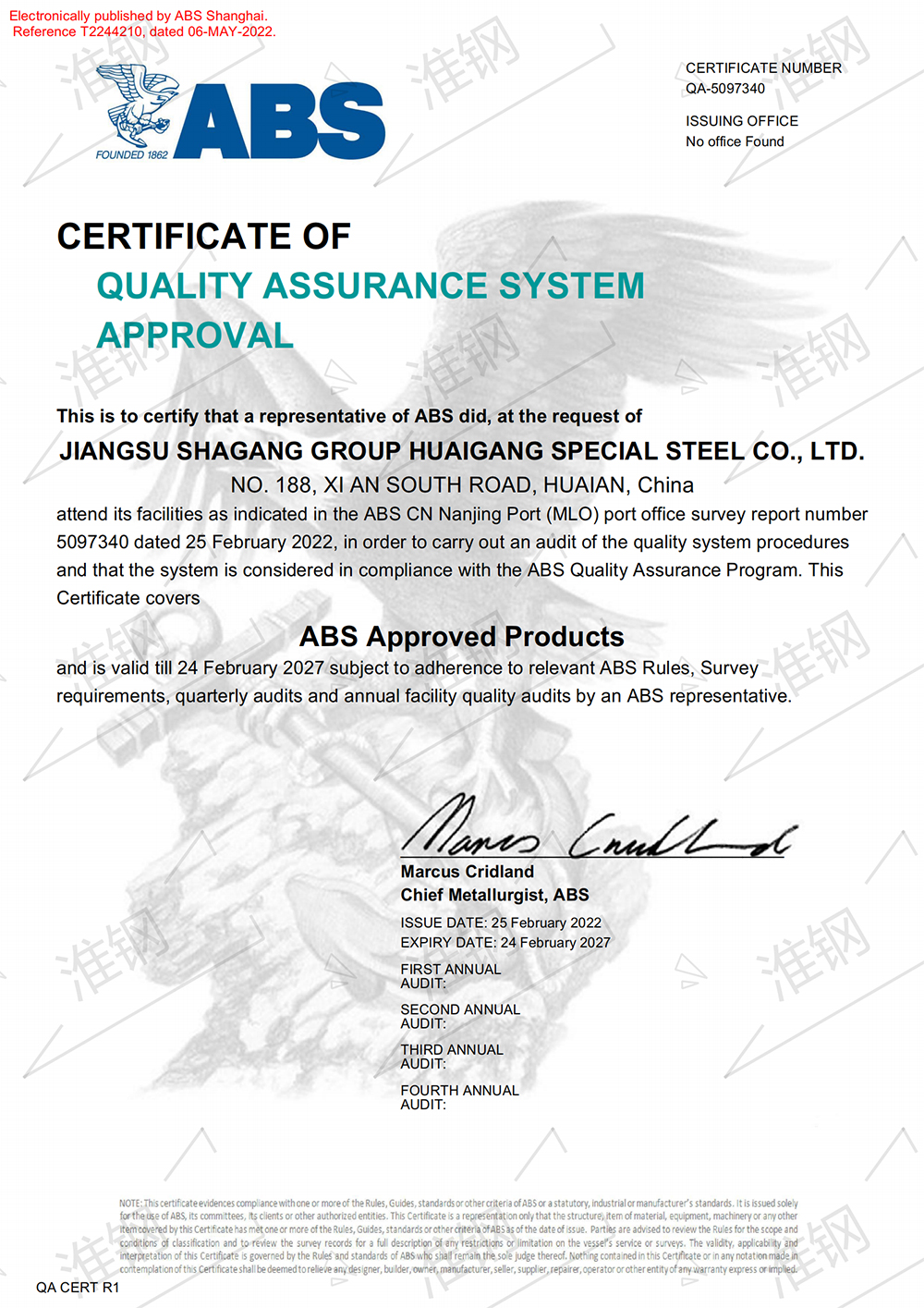 挪威船级社(DNV)锚链钢、系泊链、大圆坯认证证书
